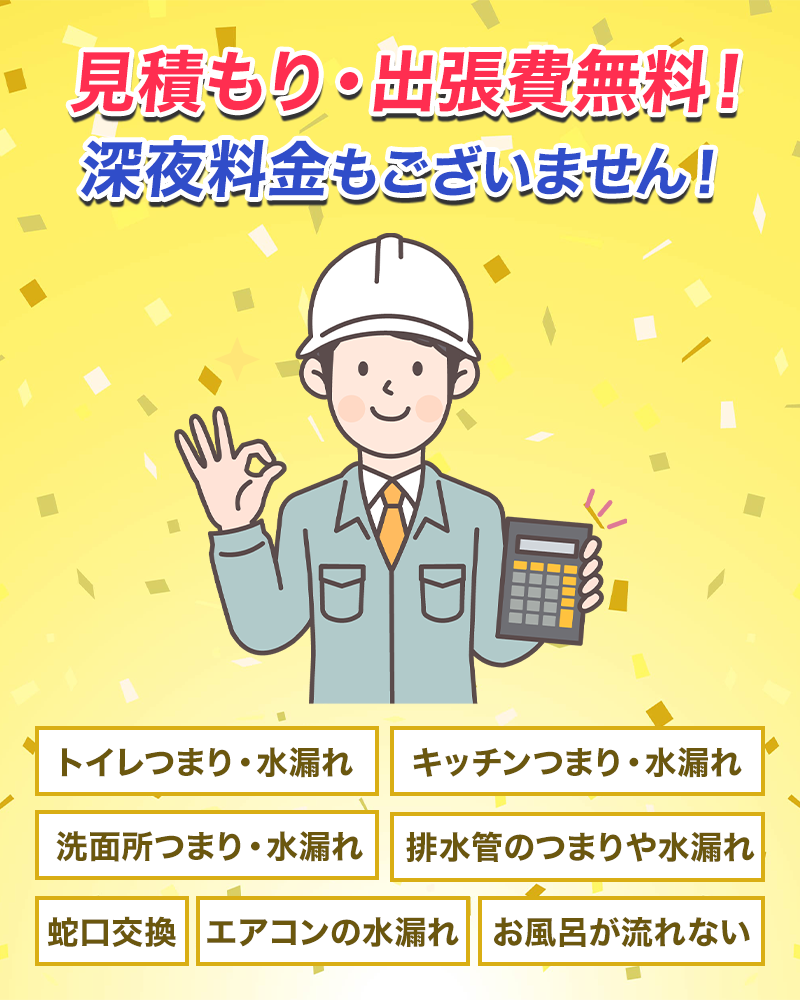 緊急の水トラブルでも深夜・早朝、土日祝日関わらず経験豊富なプロがすぐ出動し迅速に修理します。