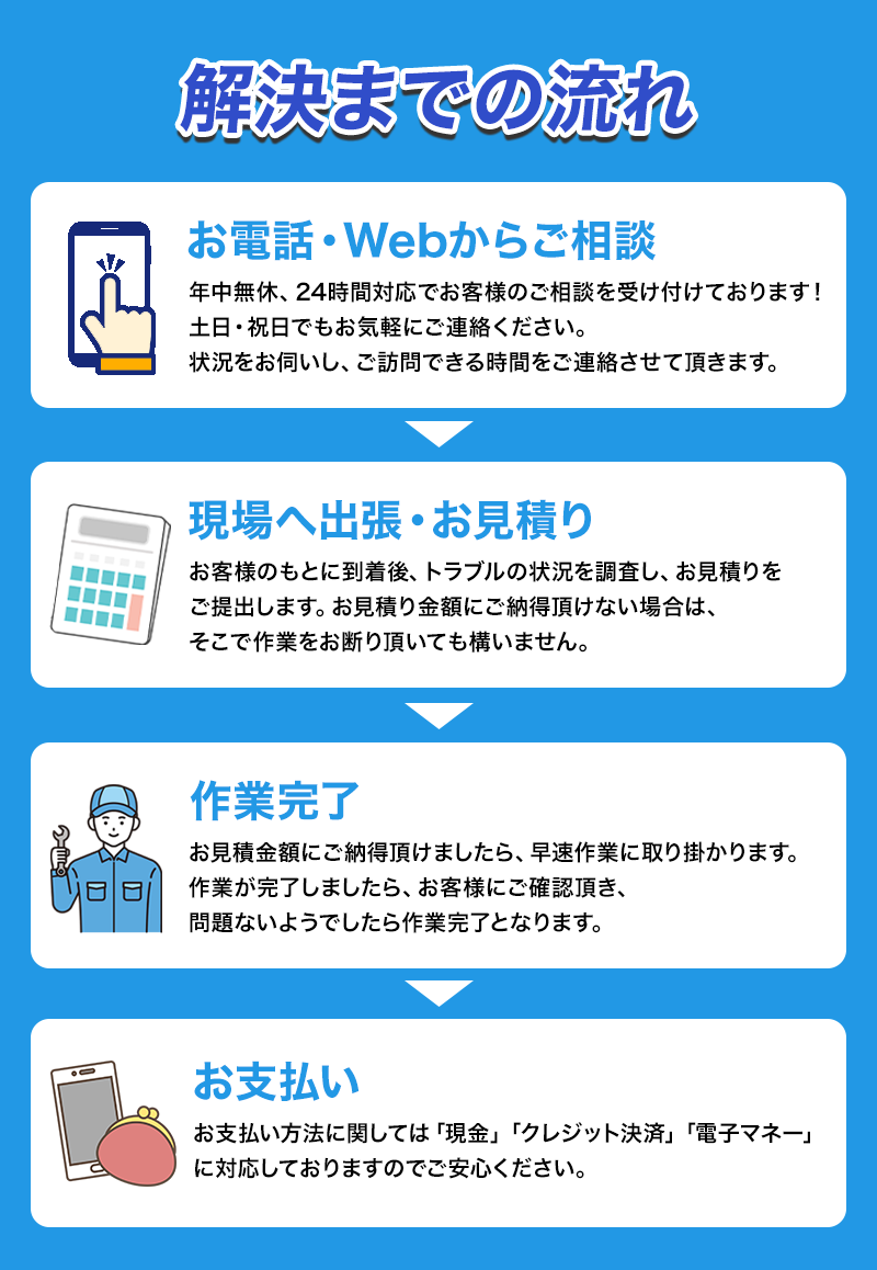 出張や見積もり無料ですのでお気軽にご相談ください。経験豊富なプロが調査し、トラブルの状況を確認しお伝えします。