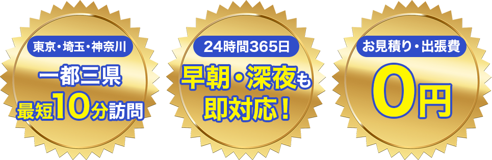 24時間365日、深夜・早朝問わず即日ご対応いたします。千葉県・東京都・埼玉県・神奈川県エリアの地域密着型のため最短10分で伺い致します!
